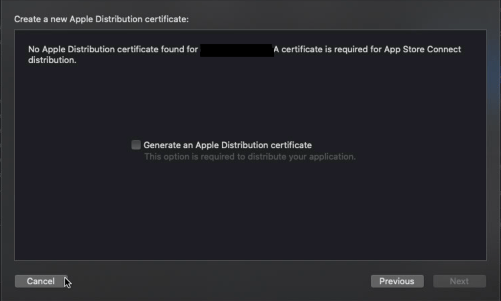 If you create the wrong type (or never created one), and are attempting to distribute through Xcode, you may see a frustrating message like the one below. You can obviously just let Xcode do the lifting for you here; but make sure to export and save securely the public and private keys in that case.