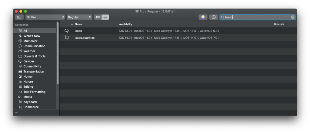 There are a couple ways inside the SF Symbols app that you can do this. The easiest way is just to select the image in question and tap the Info icon on the top tool bar, which will show a compatibility panel like below. Here we can see that ‘lasso’ is supported in iOS 13.0+ and should be safe.